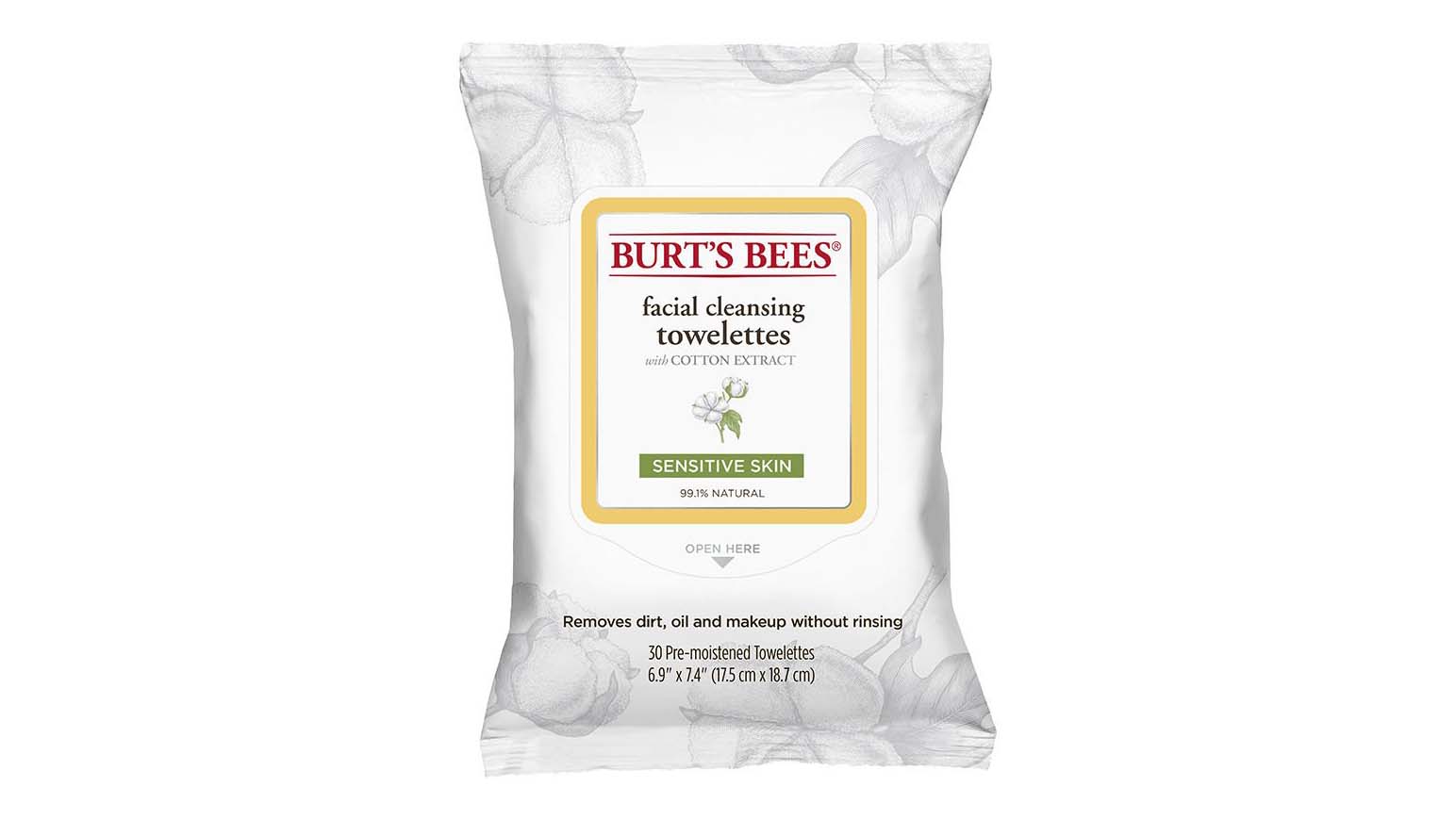- Burt’s Bees Sensitive Facial Cleansing Towelettes with Cotton Extract (450 บาท / 30 towellettes ) แผ่นผ้าเนื้อนุ่มเช็ดทำความสะอาดผิวหน้าและบริเวณรอบดวงตาโดยไม่ต้องล้างน้ำ