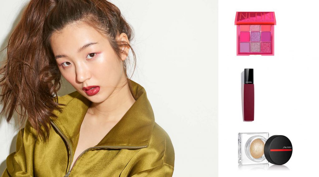 HUDA BEAUTY – Neon Pink Obsessions ใช้สีชมพูเนื้อแมตต์ ทาเปลือกตาบนชิดขอบตา ขอบตาล่างเฉพาะตั้งแต่กึ่งกลางถึงปลายเบาๆ